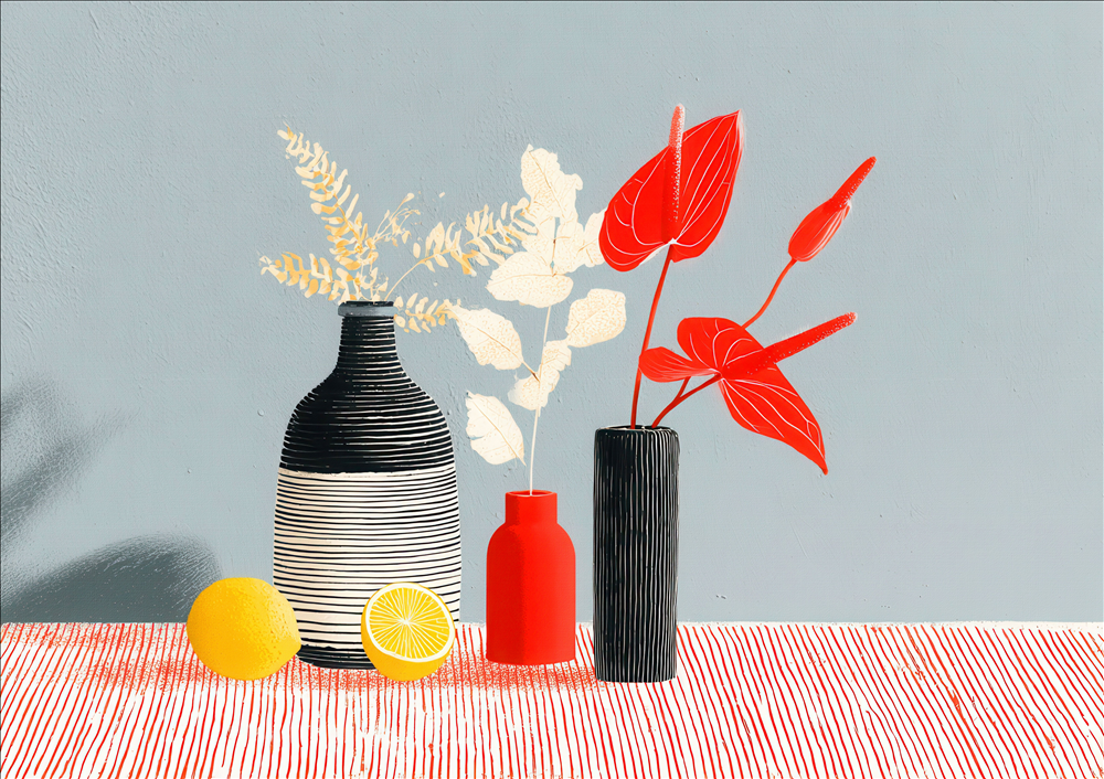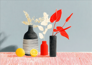 Modern Gouache is an interior design style centered around art that uses the distinct properties of gouache paint—an opaque watercolor with a matte finish. This style translates the paint's characteristics into decor, favoring a contemporary aesthetic characterized by flat, vibrant color blocking, crisp lines, and a smooth, velvety appearance. The result is a look that is both playful and refined, balancing simplicity with saturated hues to create spaces that feel clean, cheerful, and artfully curated. The style often leans into mid-century modern simplicity or bold, abstract geometric compositions.